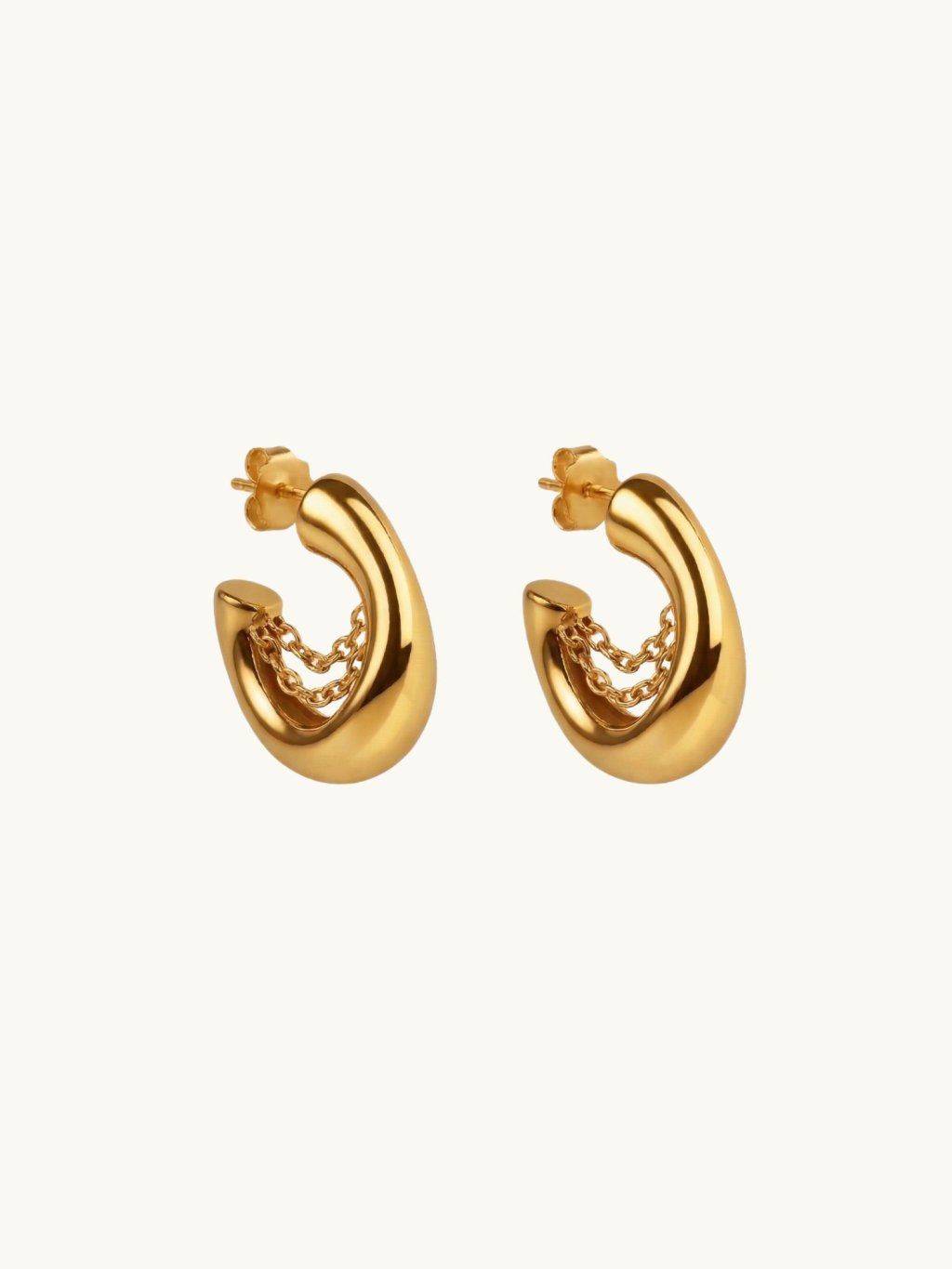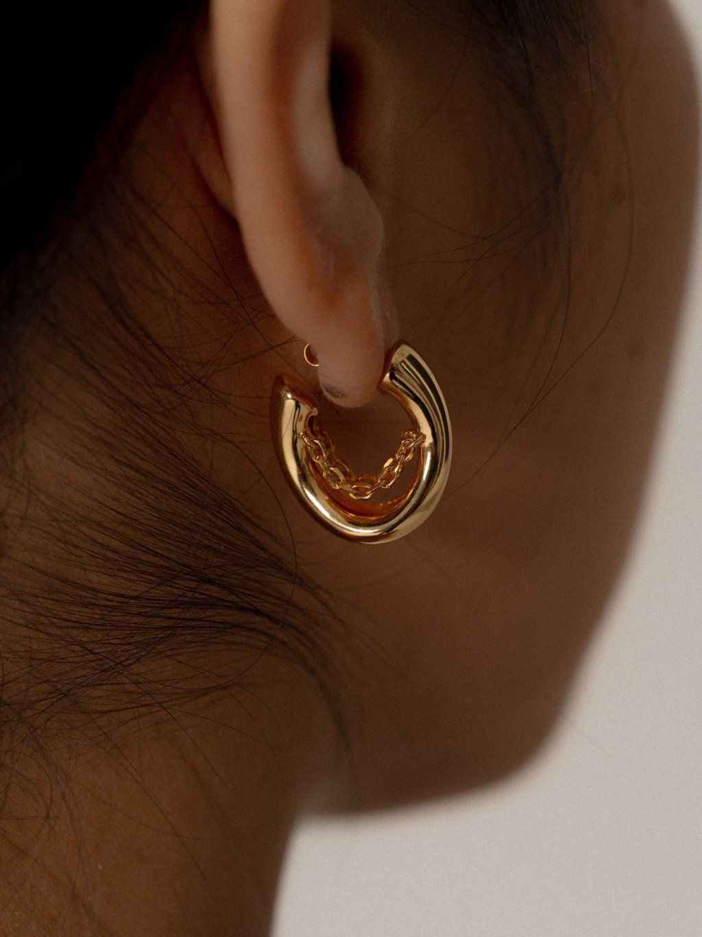 Arché chain náušnice navazují na ikonický tvar Arché a doplňují ho o jemný řetízek uvnitř. Detail, který se při pohybu lehce hýbe, zachytává světlo a dodává designu jemnou hravost. Zaoblený, organický tvar inspirovaný kapkou kovu přitom zůstává čistý, nadčasový a přirozený, zatímco řetízek přináší nový rozměr.